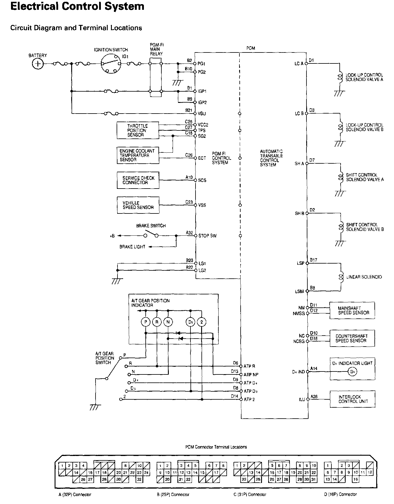 The electronic control system consists of a Powertrain Control Module (PCM), sensors, a linear solenoid and four solenoid valves. Shifting and lock-up are electronically controlled for comfortable driving under all conditions. The PCM is located below the dashboard, under the front lower panel on the passenger's side.