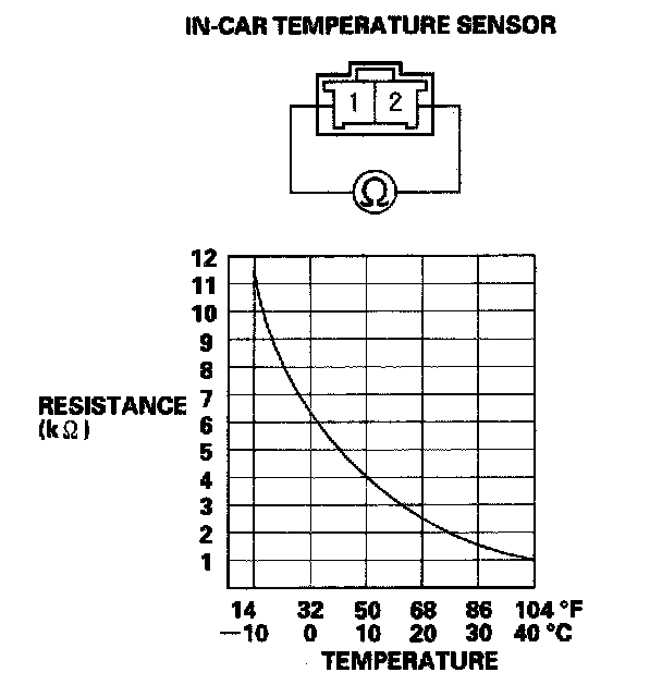 Compare the resistance reading between the No. 1 and No. 2 terminals of the in-car temperature sensor with the specifications shown in the graph; the resistance should be within the specifications.