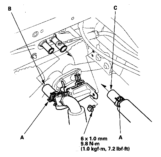 4. Remove the mounting bolt from the heater valve. Slide the hose clamps (A) back, then disconnect the inlet heater hose (B) and the outlet heater hose (C) from the heater unit. Engine coolant will run out when the hoses are disconnected; drain it into a clean drip pan. Be sure not to let coolant spill on the electrical parts or the painted surfaces. If any coolant spills, rinse it off immediately.