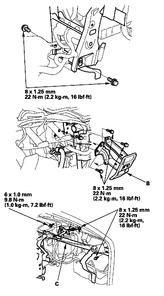8. Remove the mounting bolts in the following sequence, then remove the center bracket (A), knee bolster (B), and the hanger beam (C).