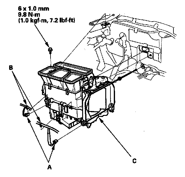 9. Disconnect the connectors (A) from the mode control motor and the air mix control motor, then remove the wire harness clips (B). Remove the mounting bolt and the heater unit (C).