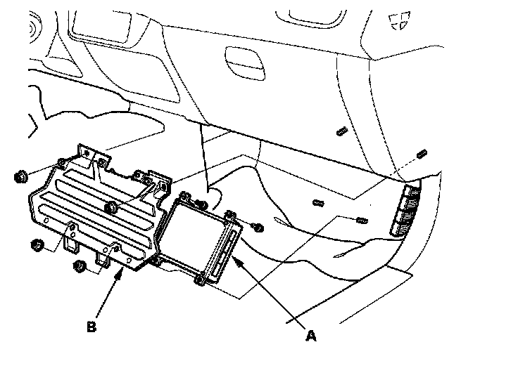 1. Pull the passenger's side carpet back to expose the ECM (A).