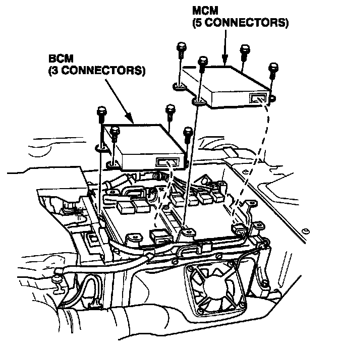 13. Install the new BCM and MCM. Make sure all module connectors are secure.