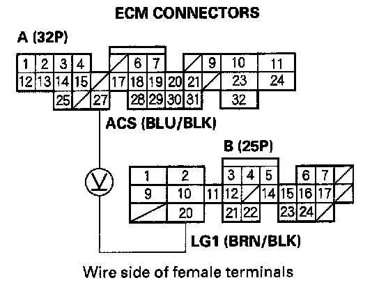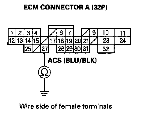 14. Check for continuity between body ground and ECM connector terminal A27.