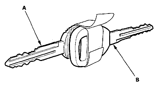 5. Tape the donor vehicle's ignition key head-to-head to the test vehicle's temporary key (A). The ECM will recognize the code from the donor vehicle's key (B) and allow you to start the engine with the temporary key.