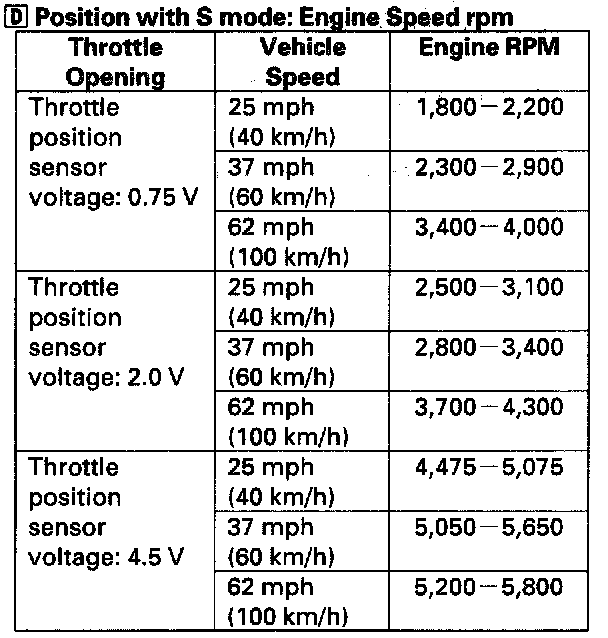 8. Test-drive the vehicle on a flat road in the position shown. While driving, check that the engine speeds meet the approximate vehicle speeds shown in the table.