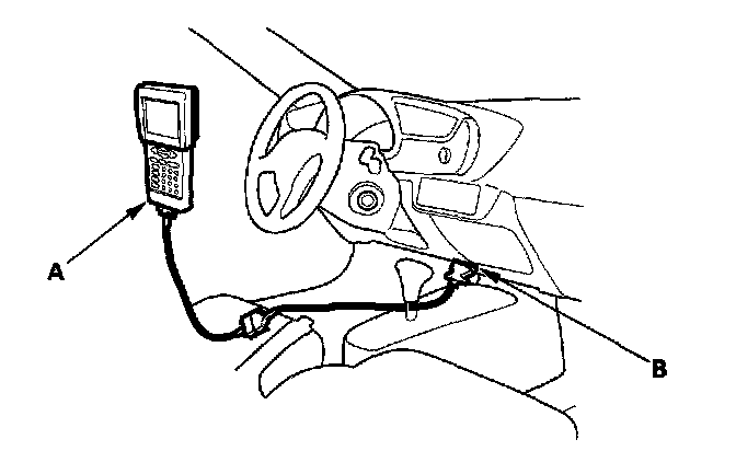 2. Reset the TCM. Use the OBD II Scan Tool or the Honda PGM Tester (A), then disconnect the scan tool or PGM tester from the DLC (B).