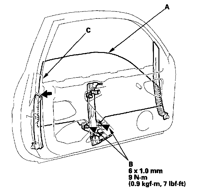 4. Push the glass against the rear channel (C), then tighten the glass mounting bolts.