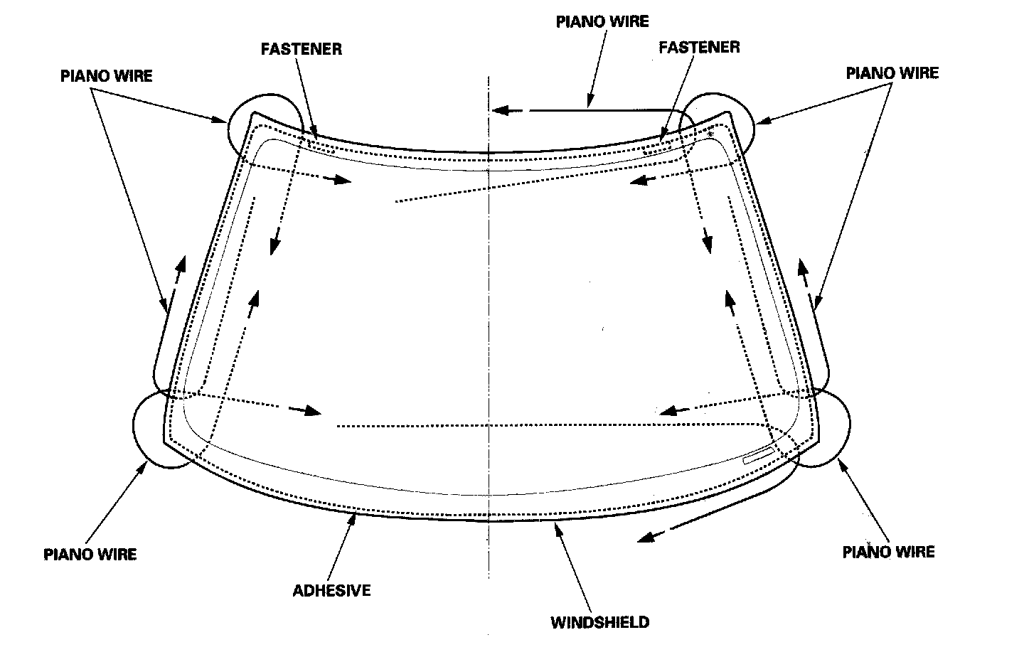 Slip the piano wire through the adhesive at each position as shown, and pull it back as indicated by the arrows.