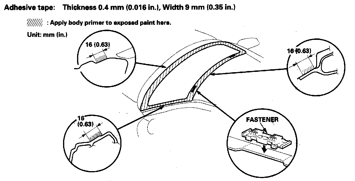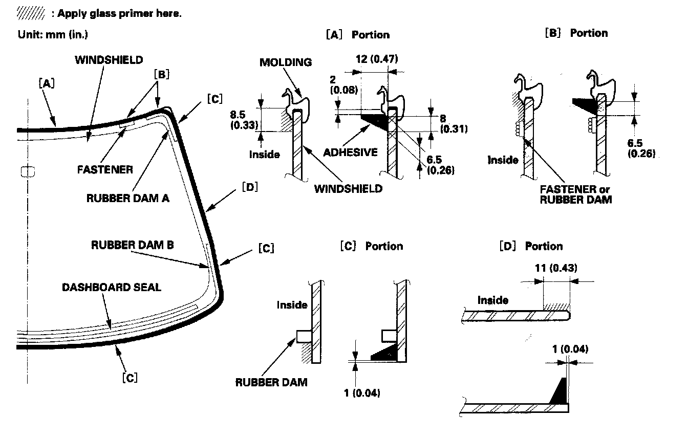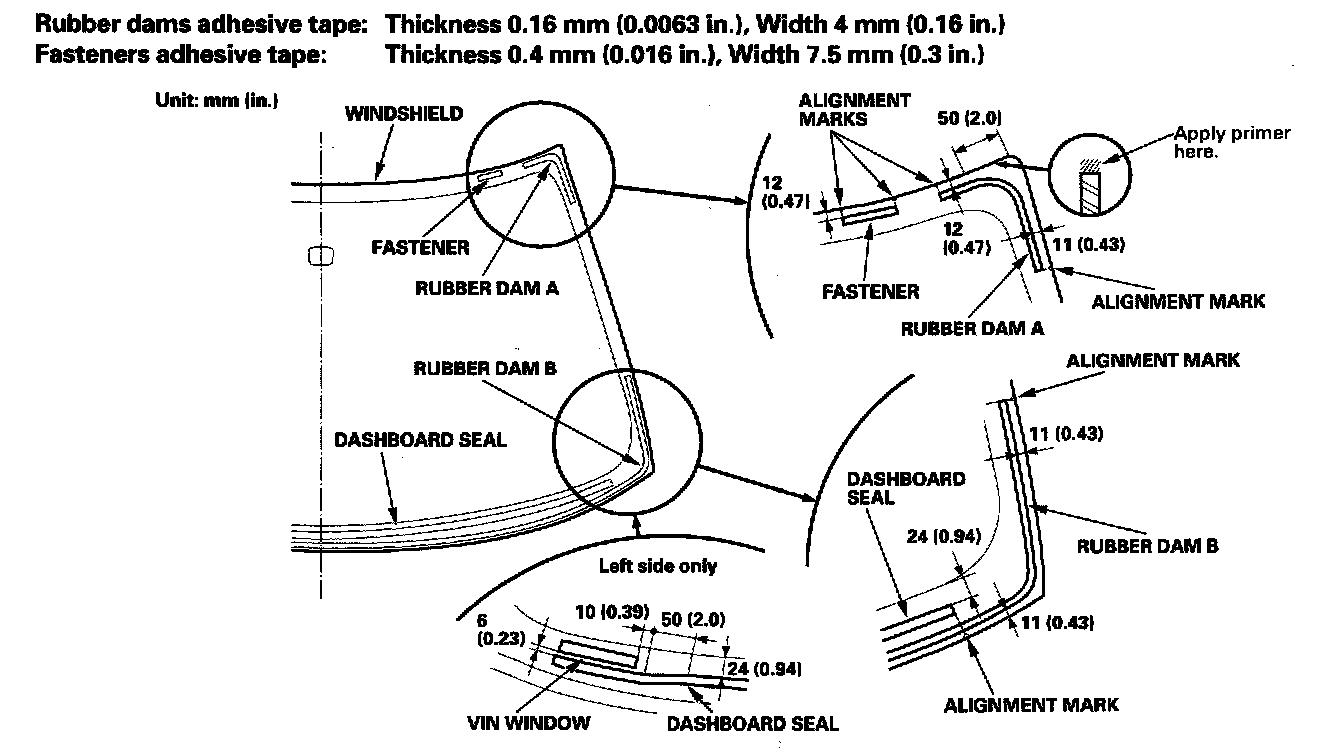 - To attach the molding, apply primer to the areas between the alignment marks of the windshield.