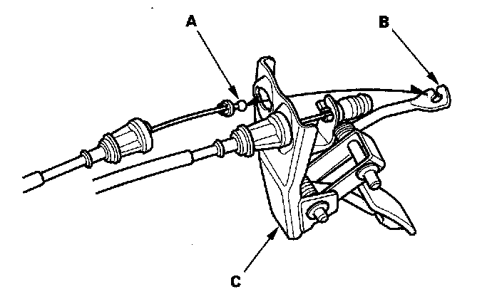 4. Disconnect the actuator cable end (A) from the arm (B) on the accelerator pedal assembly (C).