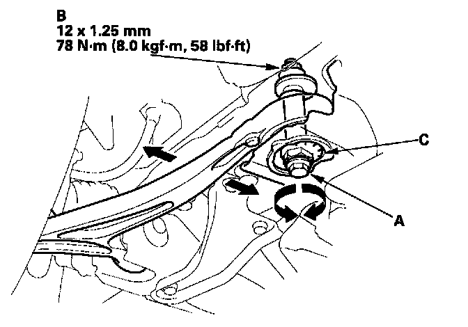 NOTE: Adjust the rear toe by adjusting the control arm and the lower arm by the same amount in opposite directions to each other (for example, when you move the control arm out, move the lower arm in, and vise versa).