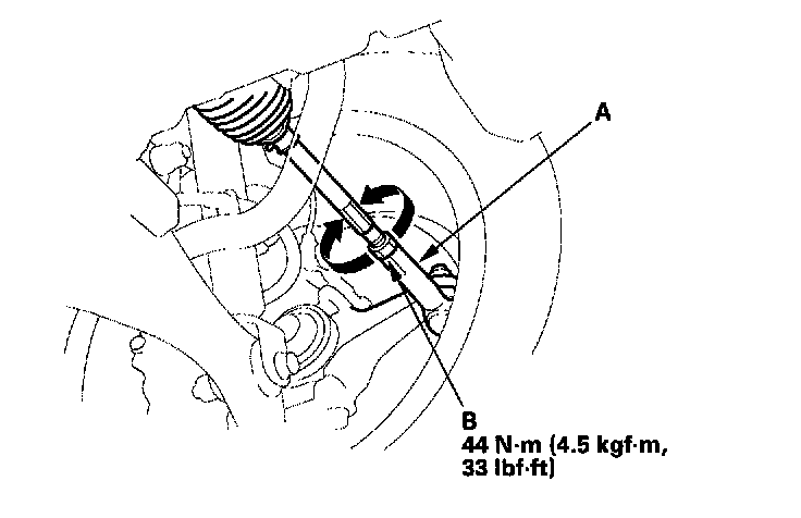 3. Hold the tie-rod end (A), and loosen the tie-rod locknut (B).