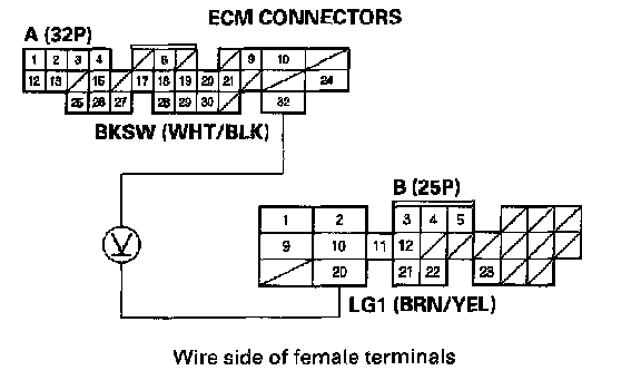 3. Measure voltage between ECM connector terminals A32 and B20 with the brake pedal pressed.