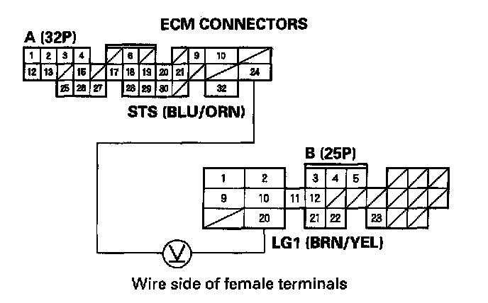 1. Measure voltage between ECM connector terminals A24 and B20 with the ignition switch in the ON (II) position and the engine start button pressed.