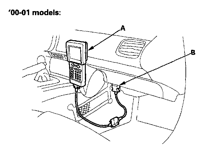 2. If the MIL stays on, connect the Honda PGM Tester (A) or an OBD II scan tool to the data link connector (DLC) (B).