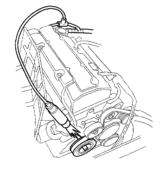 6. Aim the light toward the pointer (A). Check the ignition timing under no load conditions: headlights, blower fan, and air conditioner are not operating. If the ignition timing differs from the specification, replace the Engine Control Module (ECM).