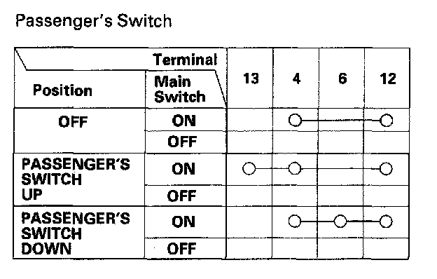 3. Check the master passenger's switch for continuity between the terminals in each switch position according to the table.