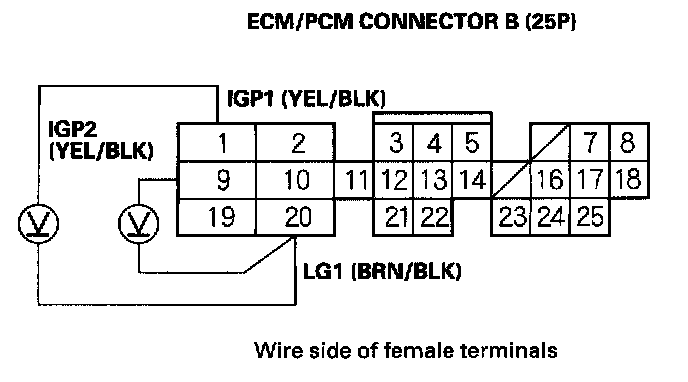 12. Turn the ignition switch ON (II), and measure voltage between ECM/PCM connector terminals B1 and B20, and between B9 and B20.