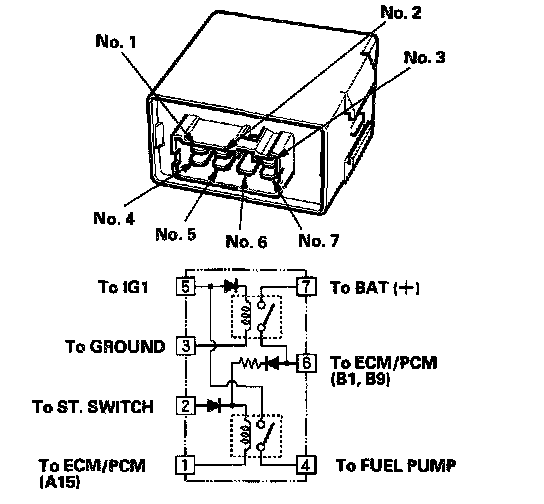 15. Connect battery power to the PGM-FI main relay 7P connector terminal No.2, and connect ground to the PGM-FI main relay 7P connector terminal No.1. Then check for continuity between the PGM-FI main relay 7P connector terminals No.5 and No.4.