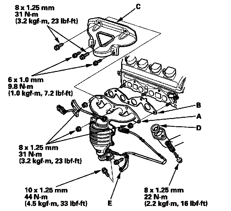 Install the exhaust manifold (A) with a new gasket (B). Loosely install the new nuts, then install the cover (C) and loosely install the new bolts.