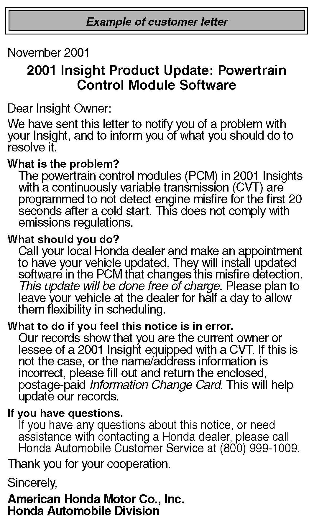 The PCM software for the Insight with CVT delays misfire detection for 20 seconds after a cold start. This delay does not comply with emissions regulations.