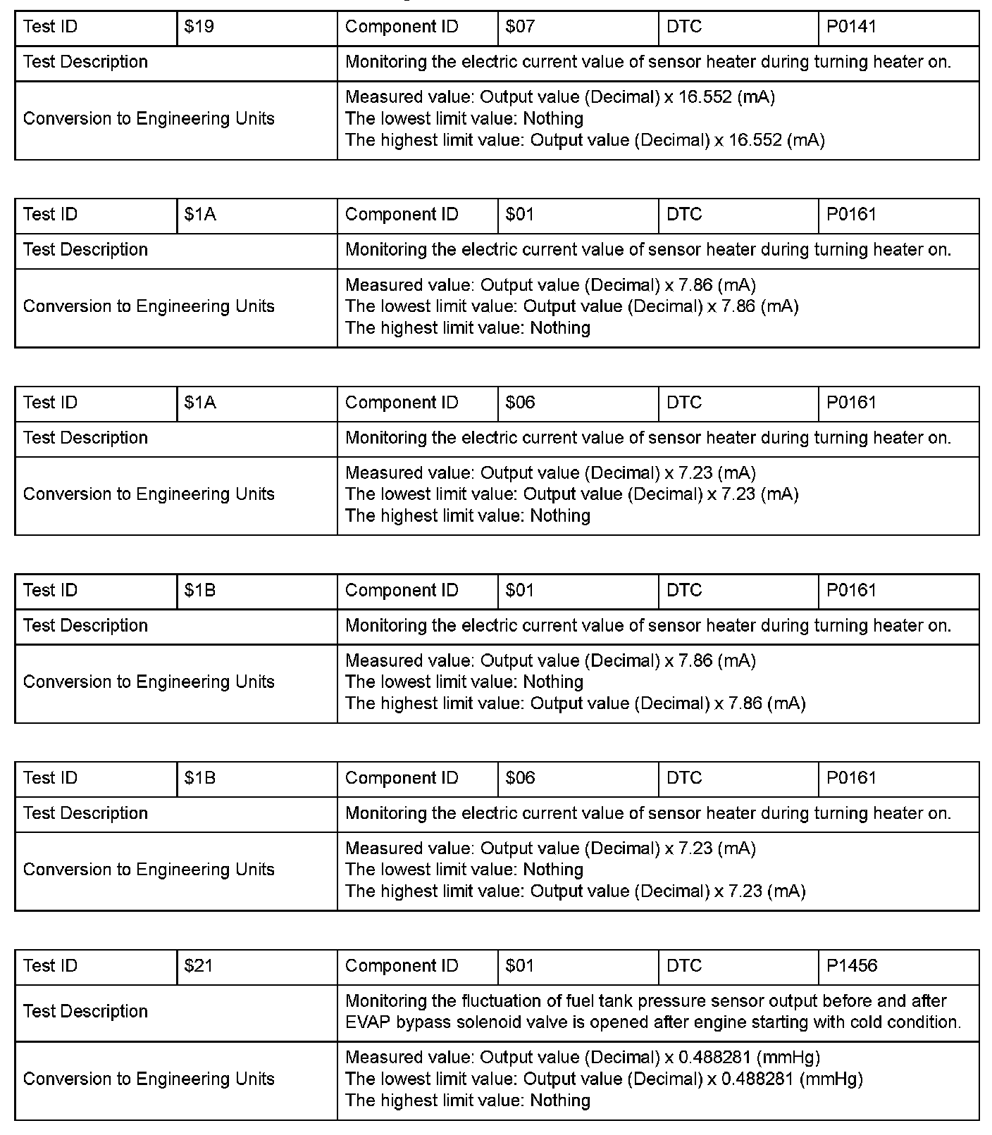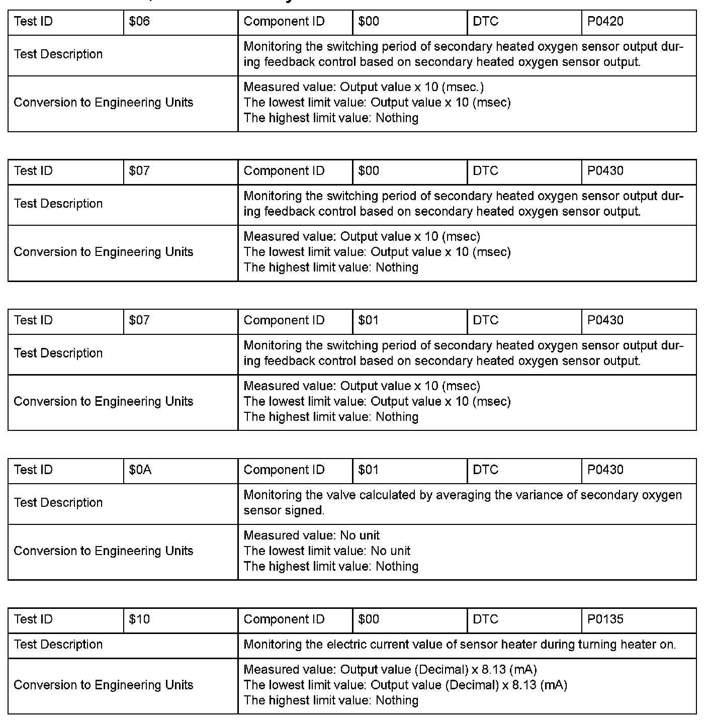SAE J1979 Mode $06 Test Information: All 2001 Hondas
