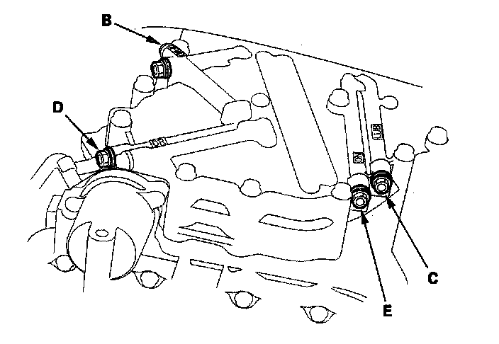 10. Connect the commercially available oil pressure gauges (specs described in step 6) to the drive pulley pressure inspection hole (D) and the driven pulley inspection hole (E).