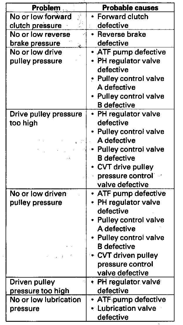 ^ Drive pulley pressure and driven pulley pressure may be above 3,430 kPa (34.3 kgf/cm2, 498 psi) when there is a transmission problem that causes the TCM to go into fail-safe mode.
