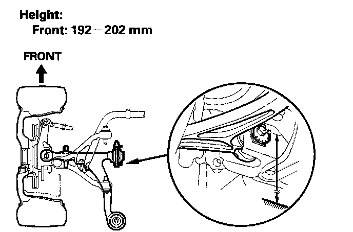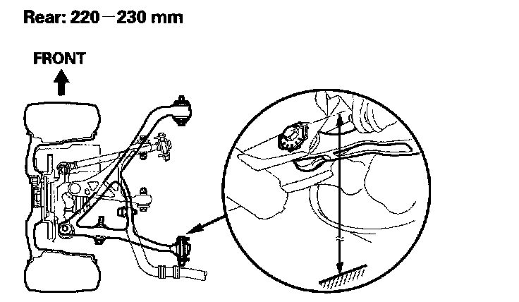 7. Check the height of each suspension. Make sure the vehicle is empty, is parked on a level surface, and has properly inflated tires (the tread wear indicator must not be showing). If the height is out of specification, adjust the load as necessary.