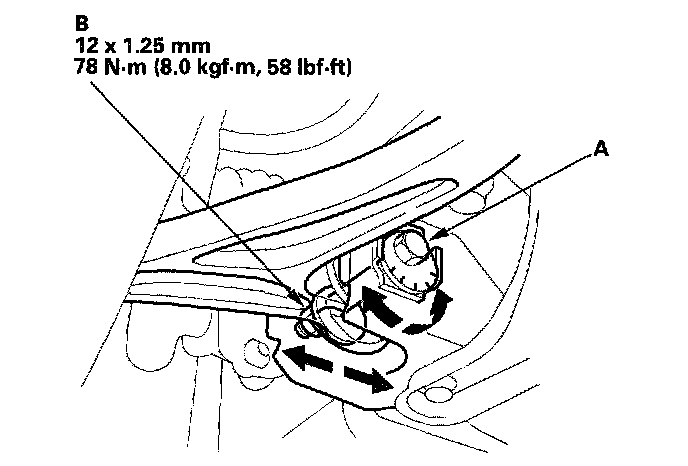 2. Hold the adjusting bolt (A) on the front of the lower arm, and loosen the self-locking nut (B).