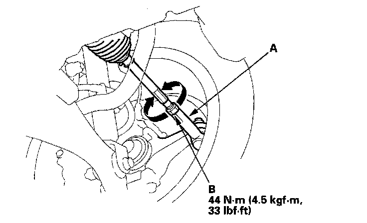 3. Hold the tie-rod end (A), and loosen the tie-rod locknut (B).