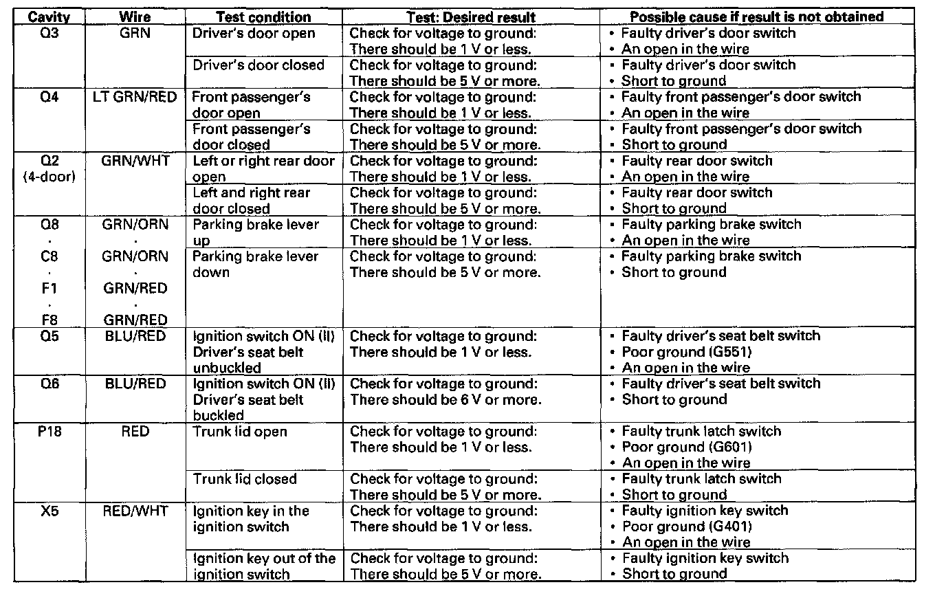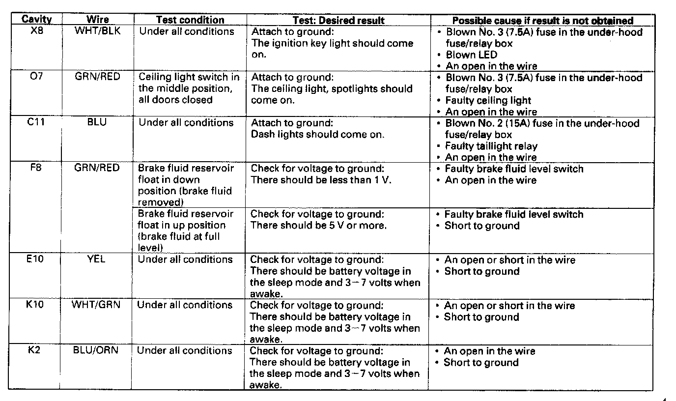 5. Reconnect the connectors to the under-dash fuse/relay box, and make sure these input tests at the appropriate connectors on the under-dash fuse/relay box.