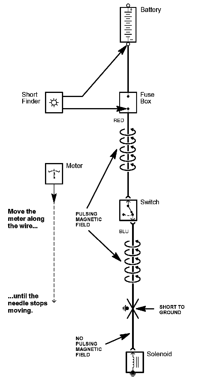 5. Beginning at the fuse box, slowly move the short finder along the circuit wiring. The meter will read current pulses through sheet metal and body trim. As long as the meter is between the fuse and the short, the needle will move with each current pulse. Once you move the meter past the point of the short, the needle will stop moving. Check the wiring and connectors in this area to locate the cause of the short.