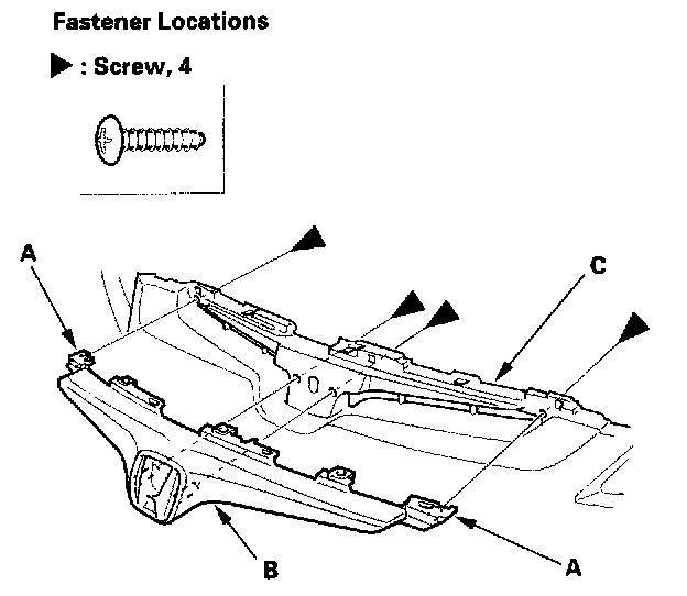 2. Remove the screws and release the hooks (A), and remove the front grille (B) from the front bumper (C) by pulling it out. Take care not to scratch the front bumper.