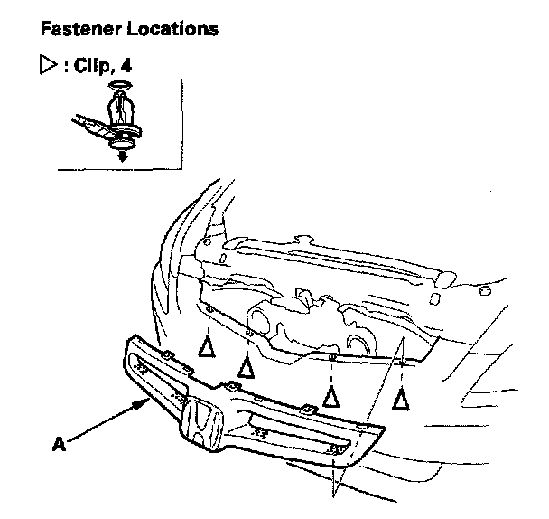 2. Remove the clips, then remove the front grille (A). Take care not to drop the clips inside the front bumper.