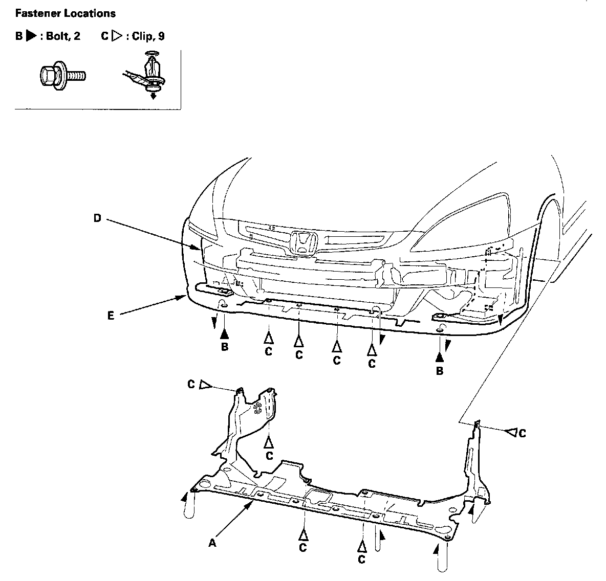 -1 From both wheel arch, remove the bolts (B) and clips (C) securing the front inner fender (D) and splash shield (on the body).