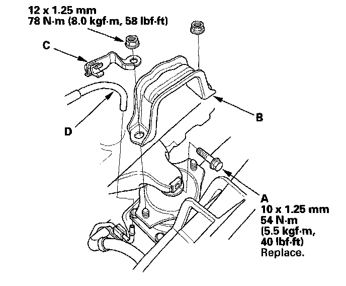 4. A/T model: Tighten the front mount bolt (A), then install the front mount stop (B) and vacuum hose clamp bracket (C). Install vacuum hose (D).