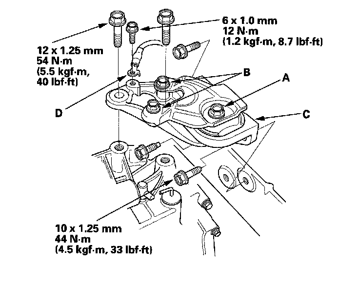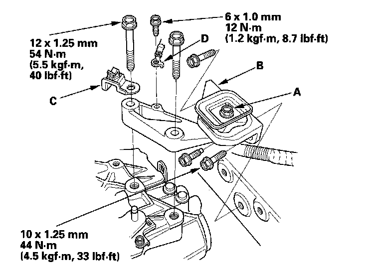 8. M/T model: Loosen the mount bolt (A), then install the transmission upper mount/bracket assembly (B), clutch line clamp bracket (C), and ground cable (D).