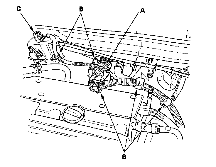 40. Install the evaporative emission (EVAP) canister hose (A) and brake booster vacuum hose (B).