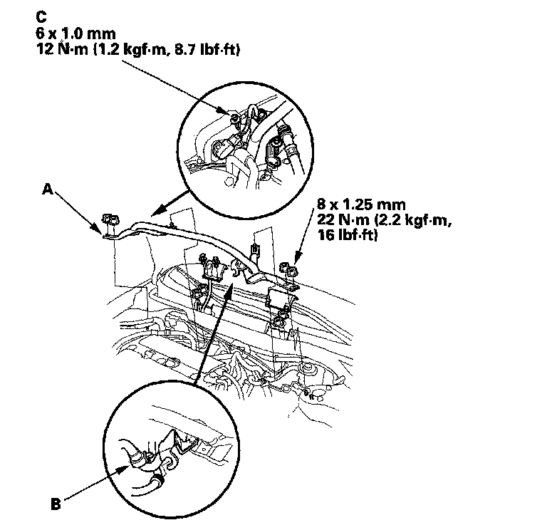 44. 2006-2007 models: Install the strut brace (A), then install the harness clamp (B) and bolt (C).