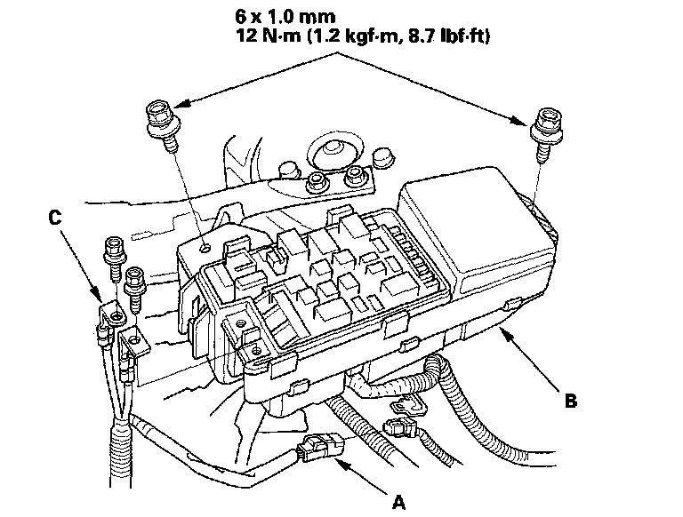 46. Install the under-hood fuse/relay box (B), then install the battery cables (C).