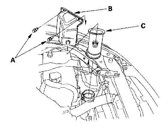 3. Remove the clips (A), then remove the air intake cover (B) and the air intake tube or duct (C).