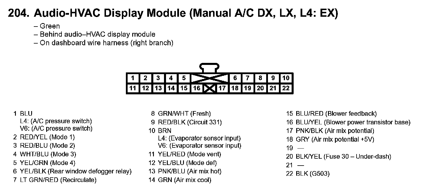 204. Audio-HVAC Display Module (Manual A/C DX, LX, L4: EX):