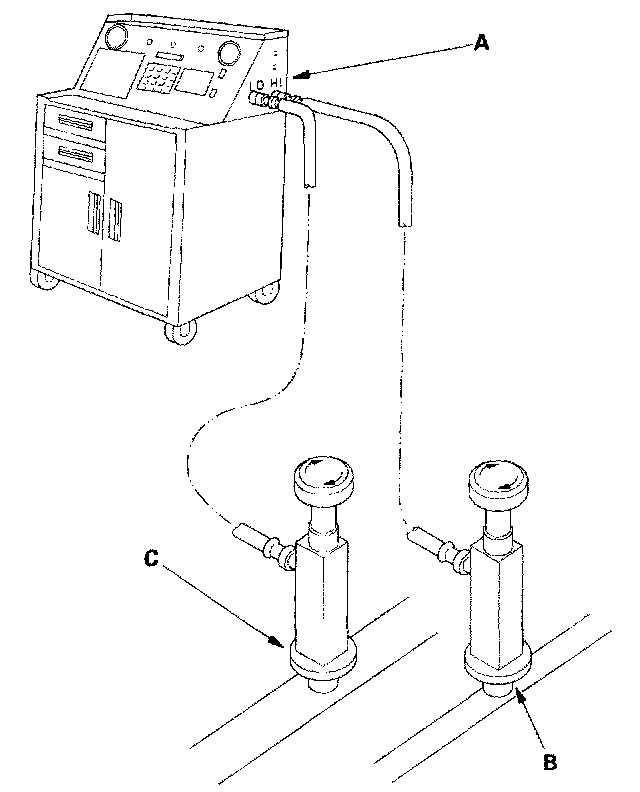 2. Connect a R-1 34a refrigerant recovery/recycling/charging station (A) to the high-pressure service port (B) and the low-pressure service port (C), as shown, following the equipment manufacturer's instructions. Evacuate the system.