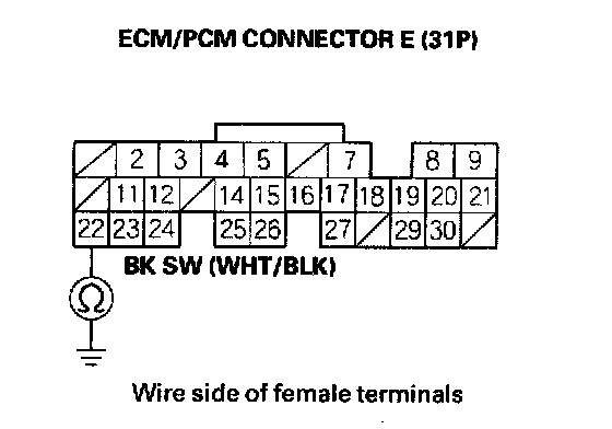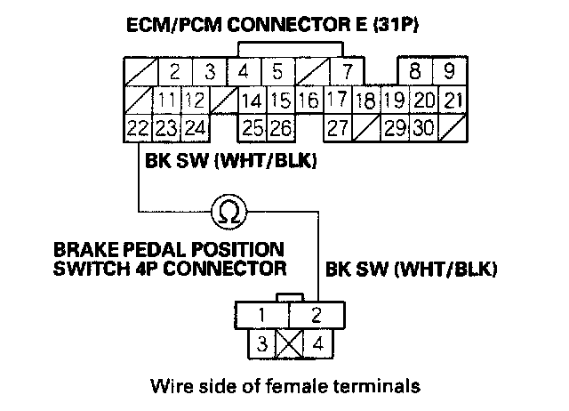 9. Check for continuity between ECM/PCM connector terminal E22 and brake pedal position switch 4P connector terminal No. 2.