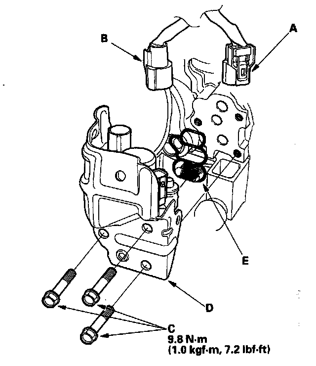 VTEC Solenoid Valve Removal/Installation1. Disconnect the VTEC solenoid valve connector (A) and the VTEC oil pressure switch connector (B).