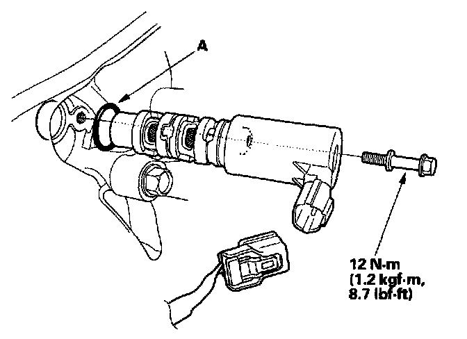1. Disconnect the VTC oil control solenoid valve connector (A).