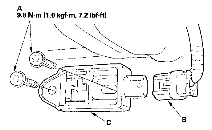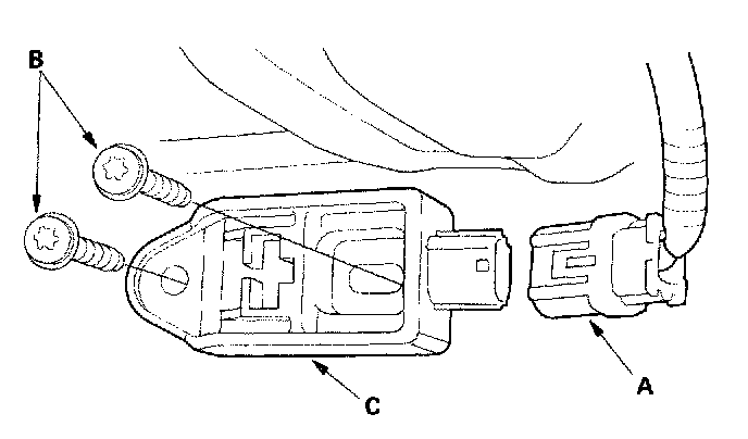 1. Install the new front impact sensor with new Torx bolts (A), then connect the engine compartment wire harness 2P connector (B) to the front impact sensor (C).