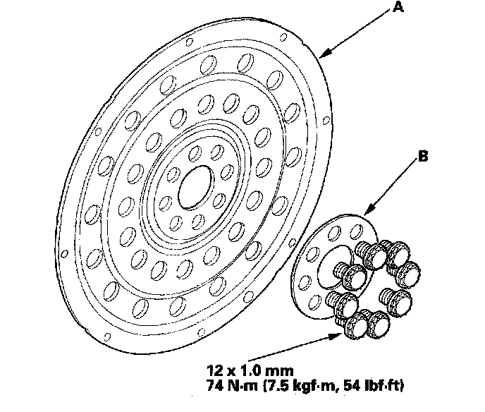 Install the drive plate and washer on the engine crankshaft, and tighten the eight bolts in a crisscross pattern in two or more steps.